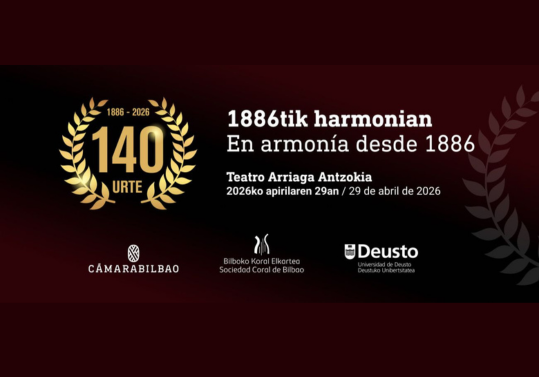 En 2026, tres instituciones fundamentales para el desarrollo económico, social y cultural de Bizkaia — la Cámara Comercio de Bilbao, la Sociedad Coral de Bilbao y la Universidad de Deusto — celebran su 140aniversario. Para conmemorar este recorrido compartido, hemos organizado un concierto en el Teatro Arriaga que aunará excelencia musical, proyección internacional y colaboración institucional.