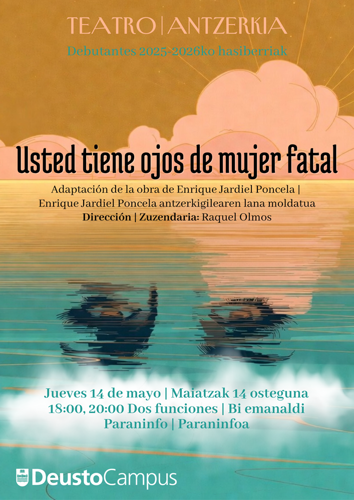 Deusto Campus Cultura te invita la muestra de teatro universitario del grupo de debutantes 2025-26 del campus de Bilbao que pondrá en escena la obra Usted tiene ojos de mujer fatal del dramaturgo Enrique Jardiel Poncela que, fiel a su estilo irónico, abre un abanico de posibilidades cómicas que no siempre fueron bien entendidas por una gran parte de la crítica de su tiempo. La muestra será el próximo jueves 14 de mayo a las 18:00 y a las 20:00 (en dos funciones) en el Paraninfo. Puedes solicitar tus invitaciones con el asiento numerado en el punto de información general del Campus de Bilbao hasta media hora antes del comienzo de cada representación.