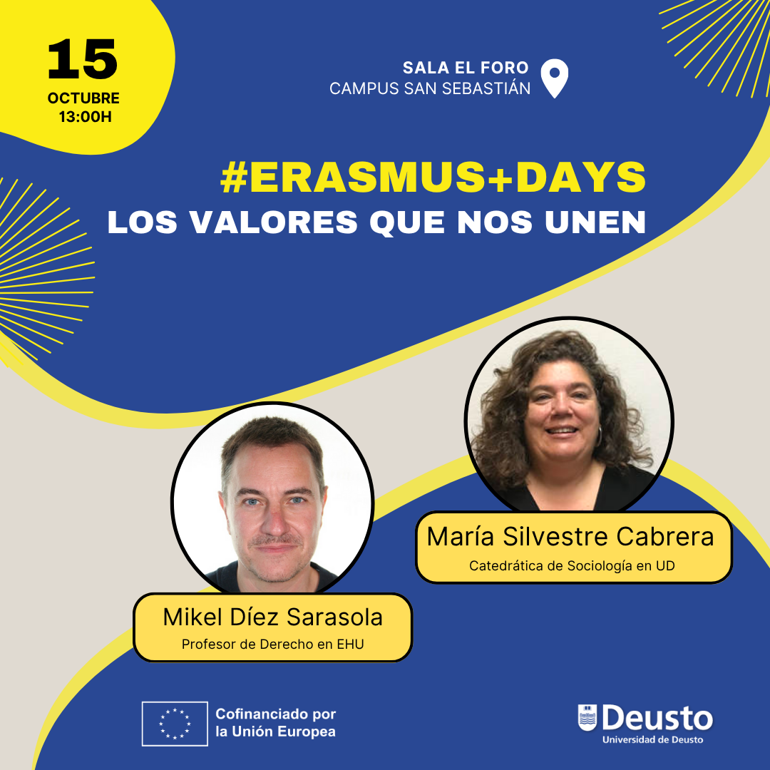 Ven a celebrar los #ErasmusDays el miércoles, 15 de octubre a las 13:00h en la Sala El Foro del Campus de San Sebastián junto a María Silvestre Cabrera (Catedrática de Sociología en la Universidad de Deusto) y Mikel Díez Sarasola (Profesor de Derecho en EHU).