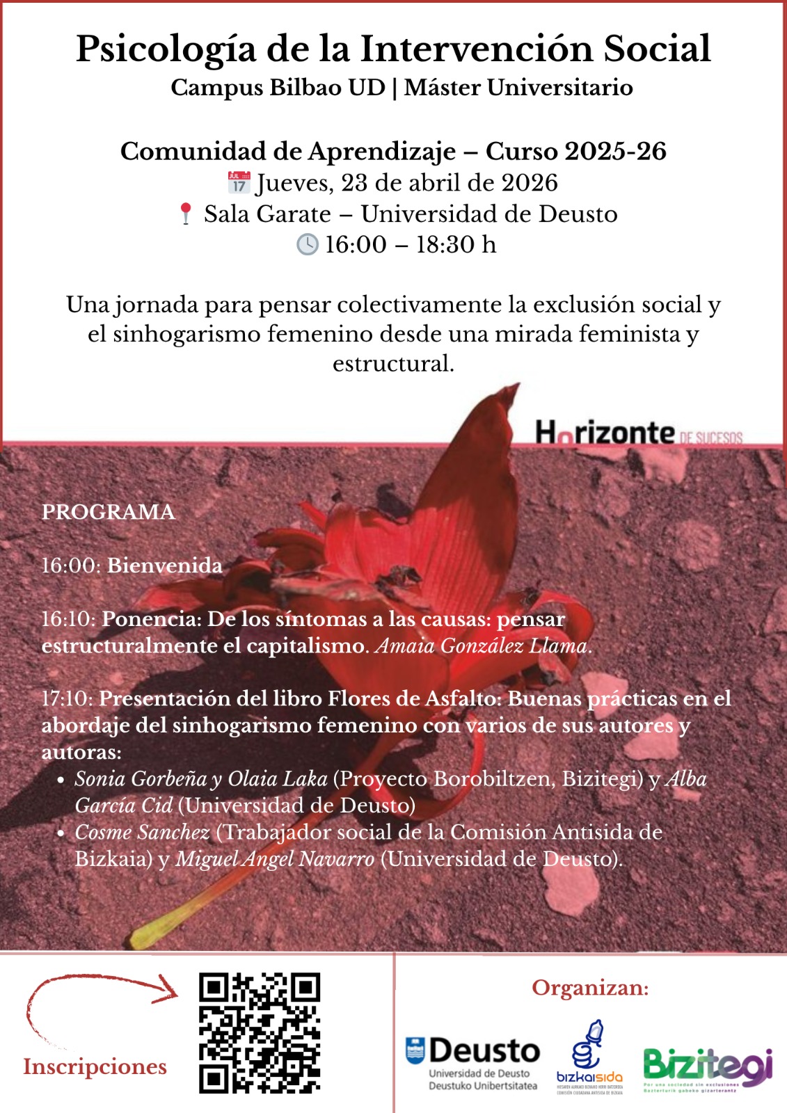 Desde el Máster de Psicología de la Intervención Social os invitamos a la próxima Comunidad de Aprendizaje para reflexionar sobre las causas estructurales de la exclusión social y presentar el libro Flores de Asfalto: Buenas prácticas en el abordaje del sinhogarismo femenino. Es una actividad organizada junto con la Comisión Ciudadana Antisida de Bizkaia y Bizitegi.