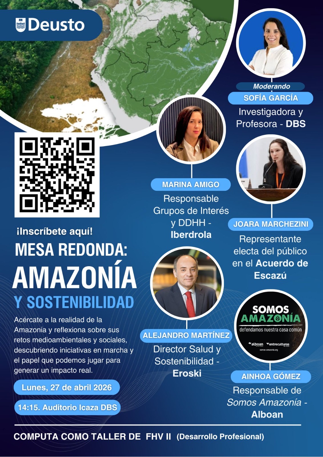 El próximo 27 de abril de 2026, a las 14:15, la Universidad de Deusto acogerá en el Auditorio Icaza de Deusto Business School la mesa redonda Amazonia y Sostenibilidad Empresarial. Esta iniciativa ha sido organizada por el grupo de Defensa del Medioambiente de la asignatura Ciudadanía por el Cambio Social, en colaboración con la asociación Alboan.