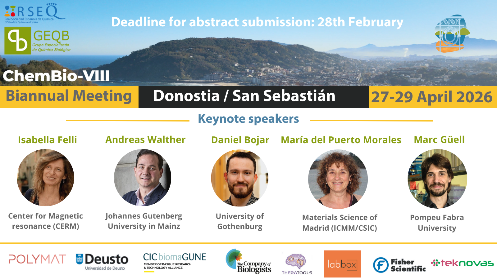 Del 27 al 29 de abril tendrá lugar la VIII Reunión Bienal del Grupo Especializado de Química Biológica (ChemBioVIII) en el Auditorium del Aquarium de Donostia-San Sebastián, un congreso científico de ámbito nacional e internacional que reúne a investigadores e investigadoras en química biológica, biología estructural, biotecnología, química medicinal y disciplinas afines.