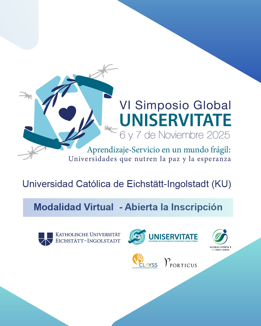 Ikaskuntza eta Zerbitzu Solidarioko Zentro Latinoamerikarrak (CLAYSS), Eichstätt-Ingolstadteko Unibertsitate Katolikoarekin (KUEI) lankidetzan, Alemanian, Uniservitate eskualdeko nodoa Europa erdialderako eta Ekialde eta Ekialde Ertainerako, VI. Sinposio Global Uniservitate antolatu du 2025eko azaroaren 6an eta 7an, "Ikaskuntza-Zerbitzua mundu hauskor batean: bakea eta itxaropena elikatzen duten unibertsitateak" lelopean. Sinposioa aldi berean egingo da ingurune hibrido batean, eta aldibereko saioak eta Ikaskuntza eta Zerbitzu Solidarioko esperientzien aurkezpena egingo dira. Espazio guztietan planetako hainbat lekutako ahotsak entzungo dira, eta erresilientzia landuko dute zerbitzurako ikaskuntzaren bidez, ikuspegi humanista batetik dimentsio espiritualari buruzko sareetan lan eginez eta Hezkuntza Itun Globalean oinarritutako esperientziak aurkeztuz.